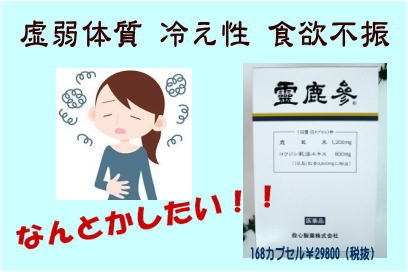 - 《霊鹿参》は、古来、強壮薬として用いられてきた動物性生薬と植物性生薬のみを成分とした滋養強壮剤です。胃腸が弱く疲れやすい方、虚弱体質で抵抗力の衰えを感じている方や、体が冷たく特に手足や腰の冷える方などの滋養強壮にすぐれた効きめを現します。