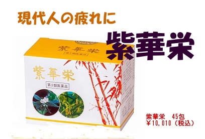 紫華栄はシコン(紫根)をはじめ、トウキ(当帰)・ニンジン(人参)など6種の生薬エキスをヨクイニン(ハトムギの種子)末とカンゾウ(甘草)末に混合した顆粒剤で、これらの有効成分の働きによって、心身の疲労・冷え性・血色不良・虚弱体質・発育期・胃腸虚弱・食欲不振などにすぐれた滋養強壮効果を発揮します。