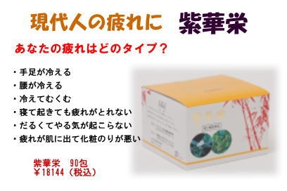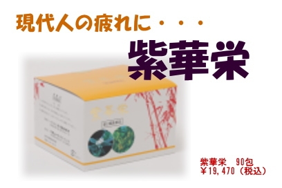 紫華栄はシコン(紫根)をはじめ、トウキ(当帰)・ニンジン(人参)など6種の生薬エキスをヨクイニン(ハトムギの種子)末とカンゾウ(甘草)末に混合した顆粒剤で、これらの有効成分の働きによって、心身の疲労・冷え性・血色不良・虚弱体質・発育期・胃腸虚弱・食欲不振などにすぐれた滋養強壮効果を発揮します。
